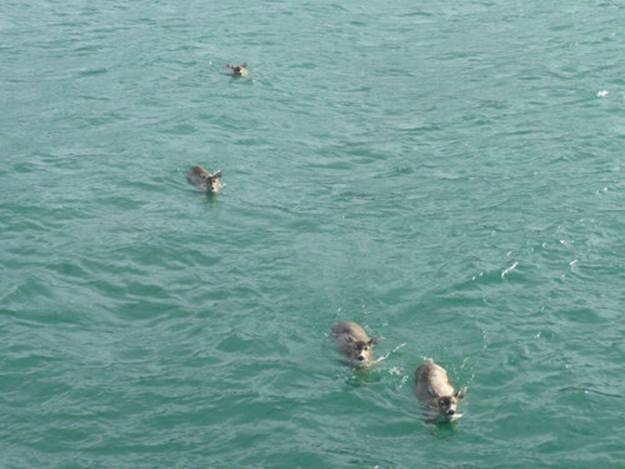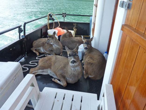 I’ve heard of salmon jumping into boats, but never anything quite like this… Tom Satre told the Sitka Gazette that he was out with a charter group on his 62-foot fishing vessel when four juvenile black-tailed deer swam directly toward his boat.