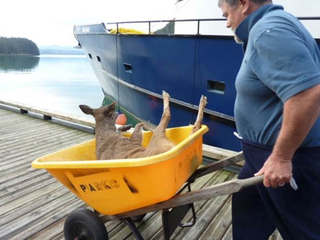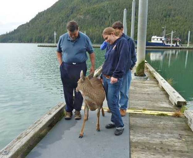 “This is a picture I took of the rescued bucks on the back of my boat, the Alaska Quest. We headed for Taku Harbour . Once we reached the dock, the first buck that we had been pulled from the water hopped onto the dock, looked back as if to say ‘thank you’ and disappeared into the forest. After a bit of prodding and assistance, two more followed, but the smallest deer needed a little more help.”