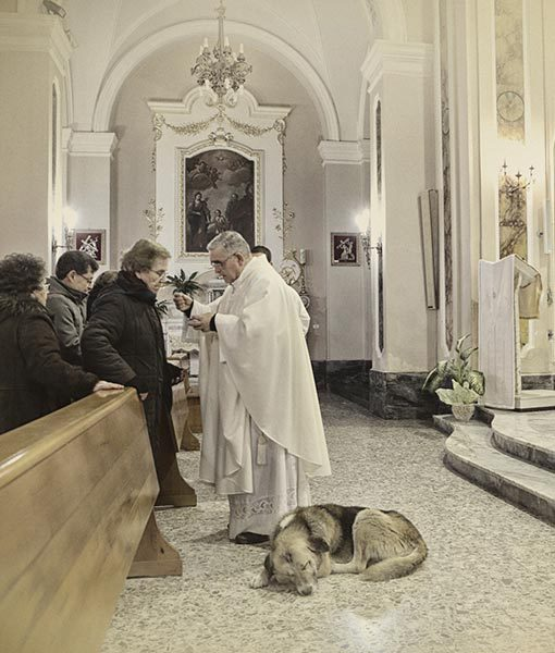 After following his mistress’s coffin up to the church on the day of her funeral, Tommy has returned daily, sitting quietly throughout masses, baptisms and funerals, according to local priest Donato Panna, who now wouldn’t do without him.