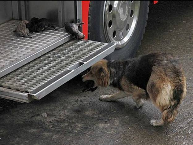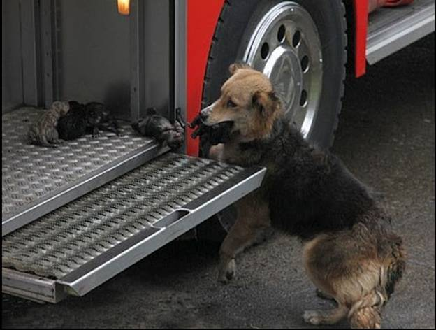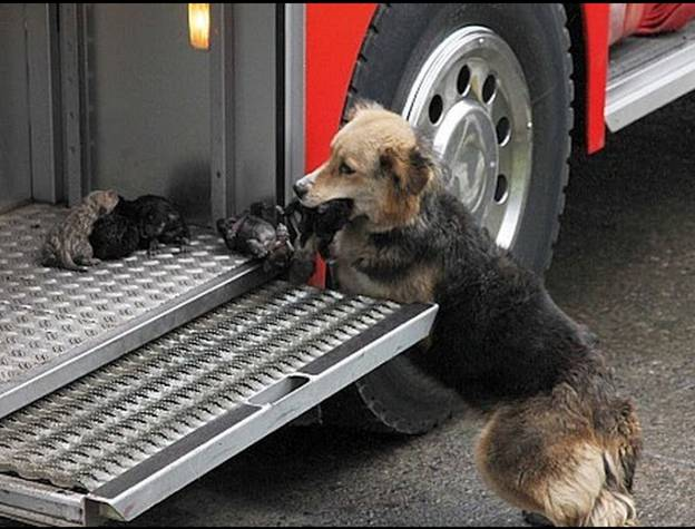The Mother dog, Amanda, raced back and forth between the house, putting her 10 day old puppies in the safest place she could find – a Fire Truck! …