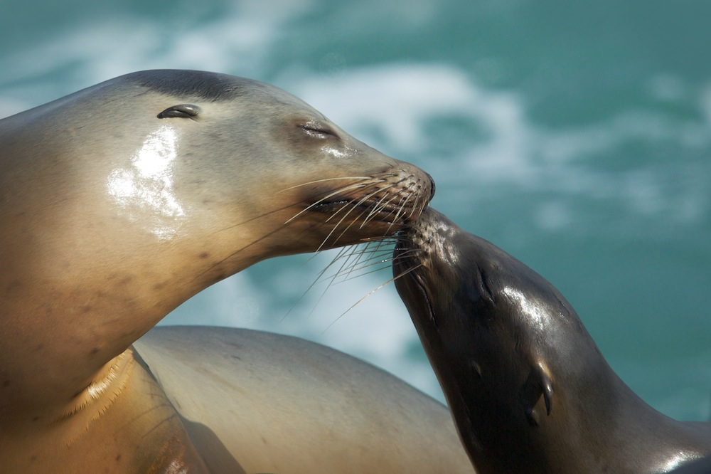 Hard to miss the aesthetic quality of a California Sea Lion. Evolutionary forces made this creature sleek and highly maneuverable underwater. Different than seals because of features like the ear flap (quite visible in this shot), sea lions are sometimes called eared seals. The males can get up to 8 feet and over 600 pounds. Females, like this beauty with her pup, come in at about 220 pounds. Sea lions can dive to a depth of 1,000 feet. In 2012 researchers discovered that they collapse their lungs at around 600 feet to store air in the upper passages and to stave off decompression sickness after ascent.