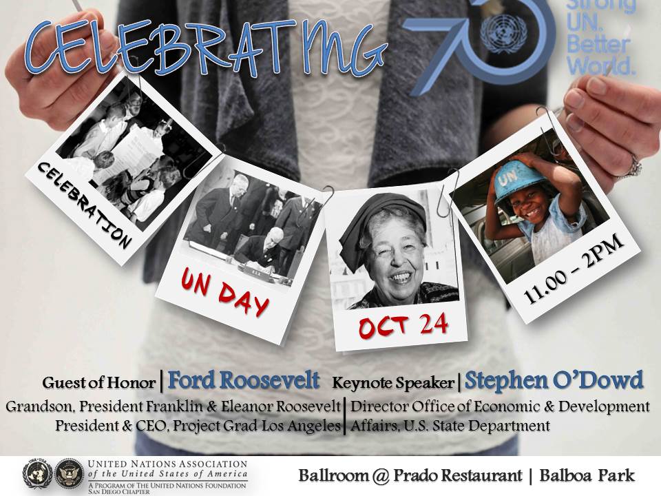 My friend Bettina Hausmann is the President of the United Nations Association in San Diego. They are having a really amazing event to celebrate United Nations day on October 24th, 2015 that coincides with the 100 year celebration of Balboa Park, the 70th anniversary of the UN, and the UNA-SD connection with Eleanor Roosevelt, who was instrumental in getting the UNA-SD started 69 years ago. Her grandson will be a featured speaker, which is really cool!