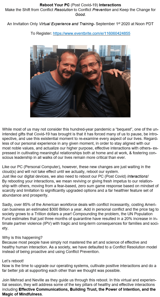 Reboot Your PC (Post Covid-19) Interactions with Dr. Mehrad Nazari Make the Shift from Conflict Resolution to Conflict Prevention and Keep the Change for Good. An Invitation Only Virtual Experience and Training– September 1st 2020 at Noon PDT