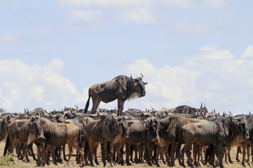 Jean-Jacques Alcalay captured the moment it looked as though a wildebeest was riding on the back of its companions