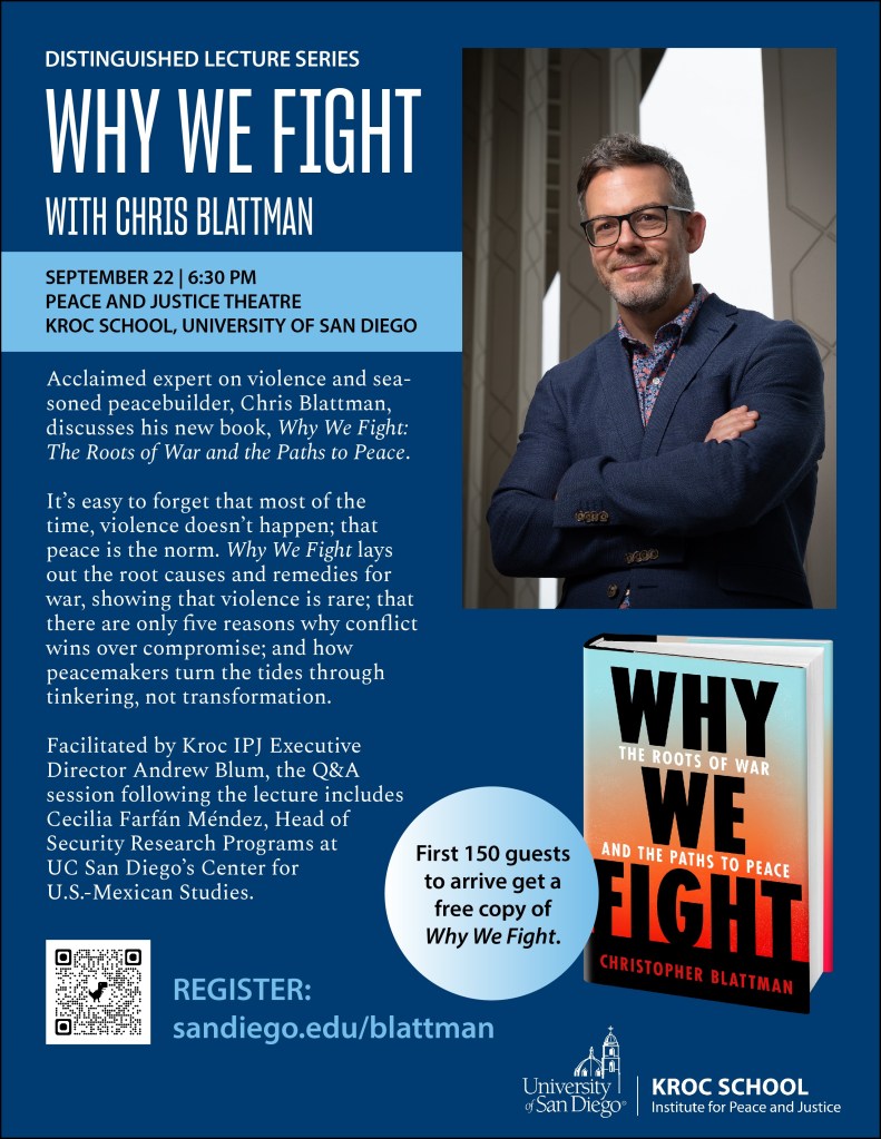 The Joan Kroc Institute for Peace & Justice is hosting acclaimed expert and peace builder Chris Blattman to discuss his new book, Why We Fight: The Roots of War and the Paths to Peace. Why We Fight shows that war is hard and peace is easier than most people think. The problem is that we only pay attention to the conflicts that happen. In these challenging times, both internationally and domestically, Blattman’s insights are of critical importance for all those who want to bridge divides and keep social and political peace.